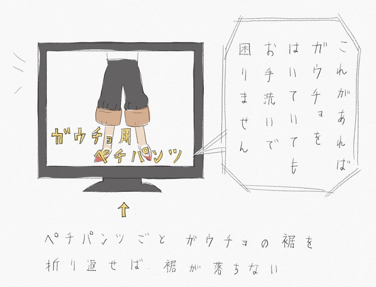 ペチパンツの裾にゴムが入っているため、ガウチョごと折り返すと留まる仕組みです。